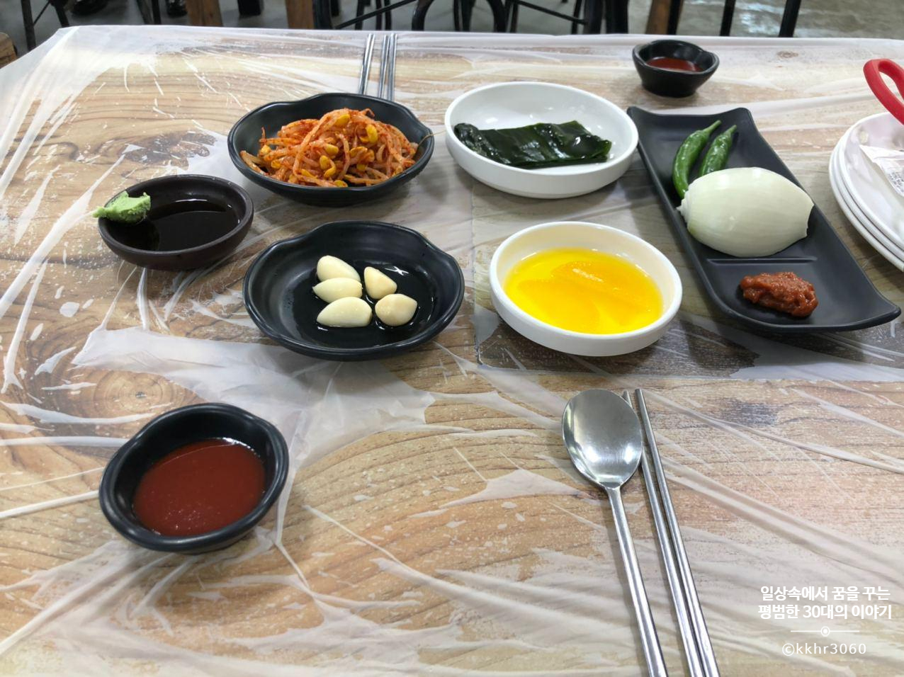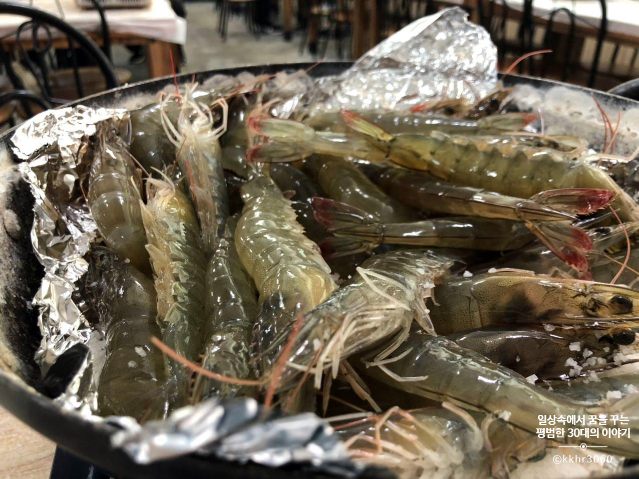 본점은 공간이 두 곳으로 나누어져 있는데 아래 사진 같은 공간이 두 개 있다고 생각하면 된다. 메인메뉴는 왕새우 소금구이 하나로 자리에 앉자마자 살아있는 생새우 1kg을 살포시 냄비 위에 올려놓아주신다. 종업원들 간에 손발이 척척 잘 맞는다는 인상을 받았다. 그리고 새우보다 뒤늦게 밑반찬을 가져다주셨다. 사실 새우구이 식당에서 어마어마한 밑반찬을 기대하긴 어려우므로 밑반찬 이야기는 패스. (밑반찬은 셀프바에서 계속해서 가져다 먹을 수 있으니 참고)