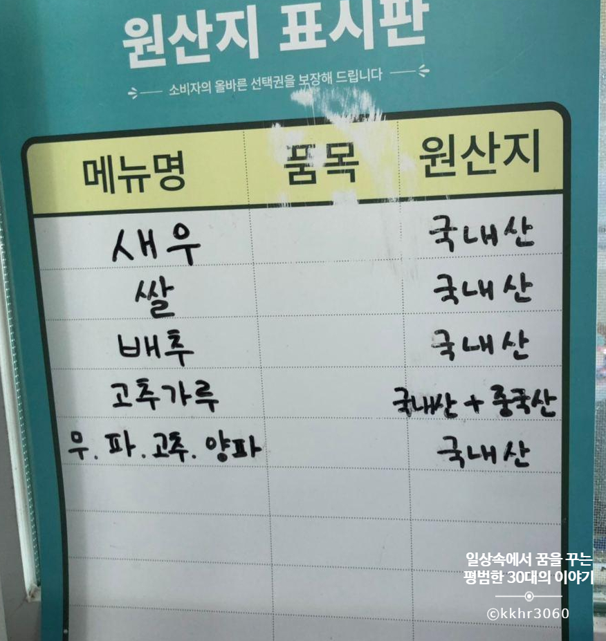 메뉴가 단출하다 보니 원산지 표시판도 단출하다. 고춧가루를 제외한 나머지 식자재는 모두 국내산이다.