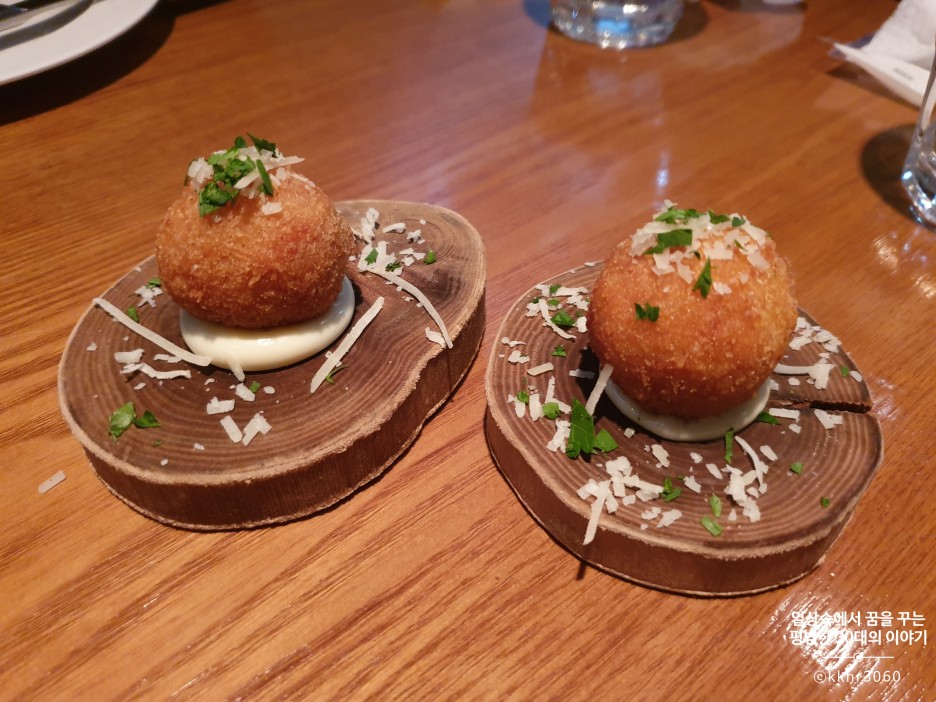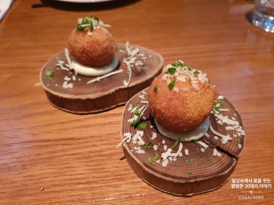 그다음으로 나온 식전 음식! 식전 음식은 상황에 따라 다양한 종류가 제공된다고 한다. 겉은 바삭하고 속은 촉촉한 크로켓 같았다. 아래에 깔려있는 하얀 소스를 듬뿍 찍어 먹으니 더 맛있었다.