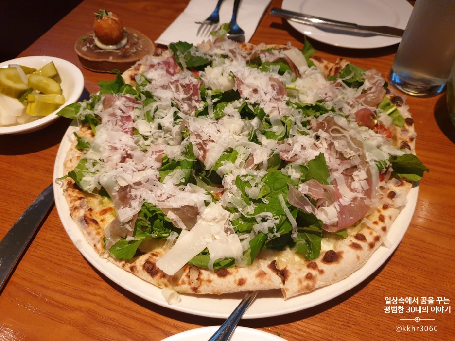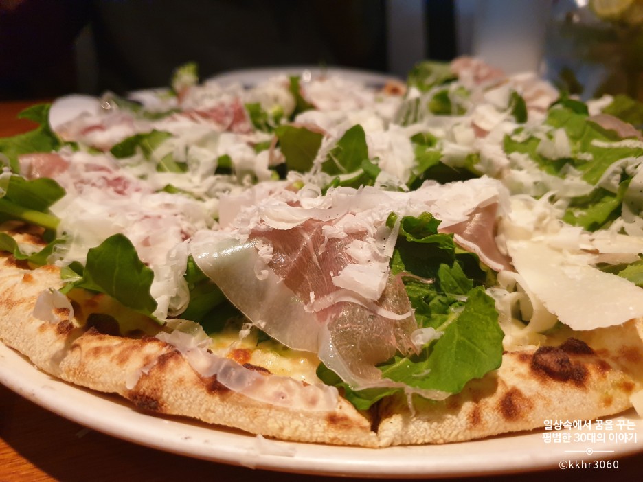 루꼴라, 모짜렐라 그리고 프로슈토가 아낌없이 올려져 있던 화덕피자! 보자마자 군침 폭발!! 나와 짝꿍은 피자를 보자마자 피자를 하나만 주문한 것을 후회하며 다음엔 꼭 피자를 사람 숫자만큼 주문하자고 했다. 그렇게 말하자마자 우린 순식간에 피자 한 판을 해치웠다. 재료들이 신선하고 아낌없이 올라가 있어서 좋았고 도우도 쫄깃하고 고소했다. 아쉬웠던 점은 도우가 너무 부드럽고 쫄깃하기만 하다는 것이었다. 조금 바삭하면 더 좋지 않았을까 싶다. 이건 지극히 개인적인 입맛이므로 다른 사람들은 어떻게 생각할지 모르겠다.