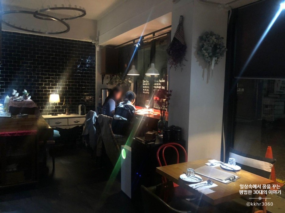 식당 내부는 그다지 넓지 않았다. 대충 둘러보니 2인석 식탁 3개, 4인석 3~4개, 3인석 1개 그리고 주방 앞 쪽에 3명 정도가 앉을 수 있는바 좌석이 있었다.
