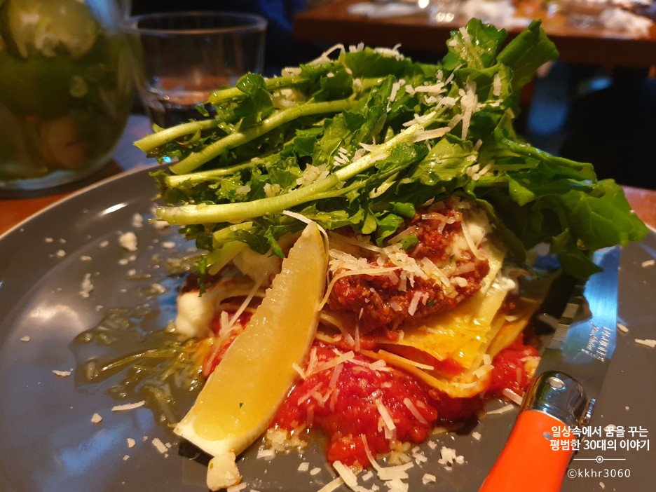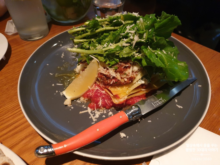 피자가 거의 다 없어져갈 때쯤 나온 라자냐. 라자냐 위에도 루꼴라가 잔뜩 올라가있었다. 샐러드를 시킨 게 아닌 게 착각이 들 정도였는데 루꼴라가 너무 신선하고 루꼴라가 잎을 하나씩 주워 먹다 보면 약간 중독적인 맛이라 내가 거의 다 먹어치웠다. 짝꿍 말로는 라자냐가 본인이 프랑스랑 스페인에서 살 때 식당에서 먹었던 라자냐 맛과 비슷하다고 했다. 그만큼 라자냐가 너무 맛있다며 다음에 오면 먹고 싶은 게 너무 많은데 고민된다고 벌써부터 오지도 않은 미래를 걱정했다. 처음에는 피자 하나와 라자냐 하나로 배가 찰까 싶어 중간에 파스타나 스테이크를 하나 더 시킬까도 했지만 차츰 배가 불러오기 시작해 결국 추가 주문은 하지 않았다. 나중에 다 먹고 나서 대식가인 우리 둘 모두 배가 너무 불러서 소화를 시키기 위해 한참을 걷다가 집에 갔다.