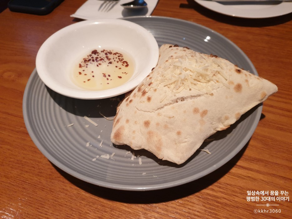 주문하고 얼마 지나지 않아 화덕에 구운 식전 빵을 가져다주셨는데 이게 은근 별미였다. 고소하면서 쫄깃했다. 게다가 살짝 올려준 치즈가 자칫 밋밋할 수 있는 빵의 풍미를 더했다.