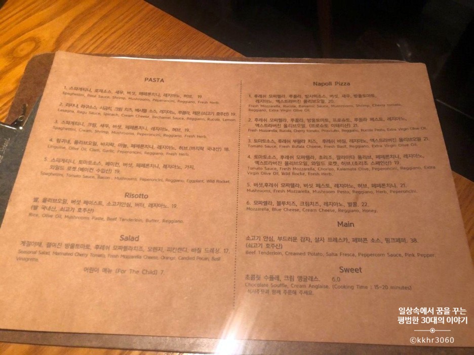 메뉴는 파스타, 샐러드, 리조또, 피자, 스테이크 5가지 종류가 있었는데 우리는 2번 파스타 (라자냐, 라구소스, 시금치, 크림 치즈, 베사멜 소스, 레지아노, 루꼴라, 레몬, 호주산 소고기)와 2번 피자 (후레쉬 모짜렐라, 루꼴라, 방울토마토, 프로슈토, 루꼴라 페스토, 레지아노, 엑스트라 버진 올리브오일)를 주문했다.