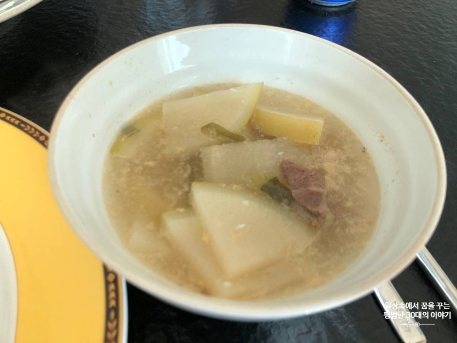 뭇국 - 국거리 소고기, 무, 들기름, 소금, 진참치액, 대파, 다진 마늘