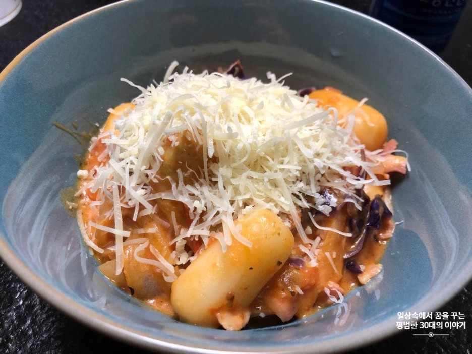 로제 치즈떡볶이 - 치즈떡, 양배추, 양파, 어묵, 대파, 토마토소스, 우유, 파마산 치즈, 베이컨