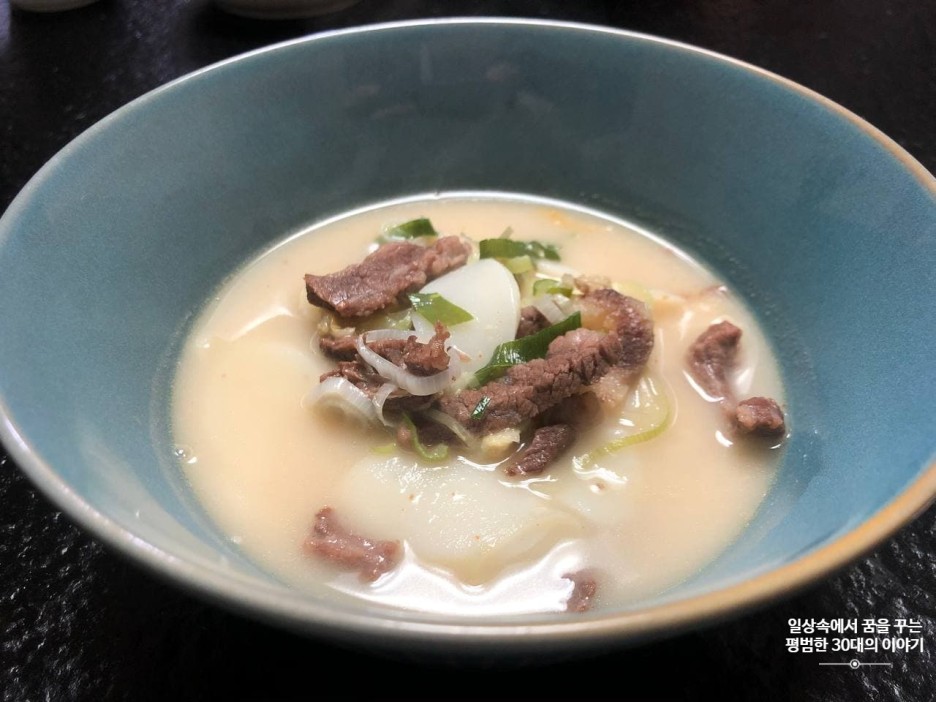 떡만둣국 - 국거리 소고기, 떡, 만두, 대파, 진참치액, 소금, 다진 마늘