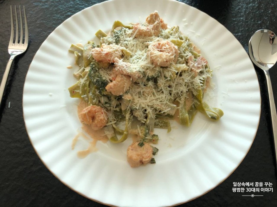 투움바 파스타 - 베이컨, 새우, 양파, 브로콜리, 다진 마늘, 쪽파, 생크림, 우유, 간장, 고춧가루