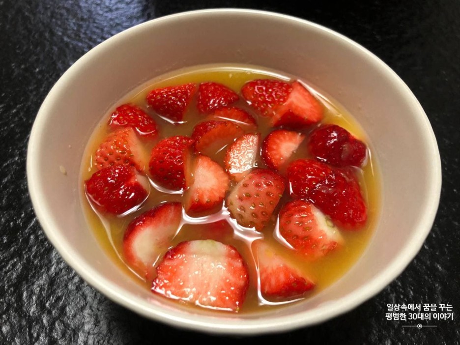 메뉴: 짝꿍의 최애 디저트 직접 짠 오렌지 즙에 딸기 퐁당