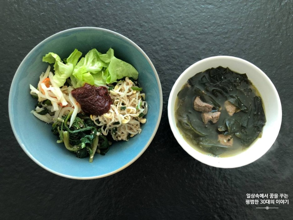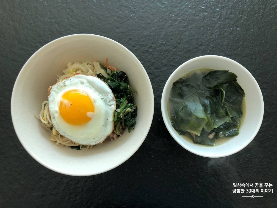 메뉴: 비빔밥(무나물, 시금치, 콩나물, 계란 프라이, 참기름, 고추장), 미역국