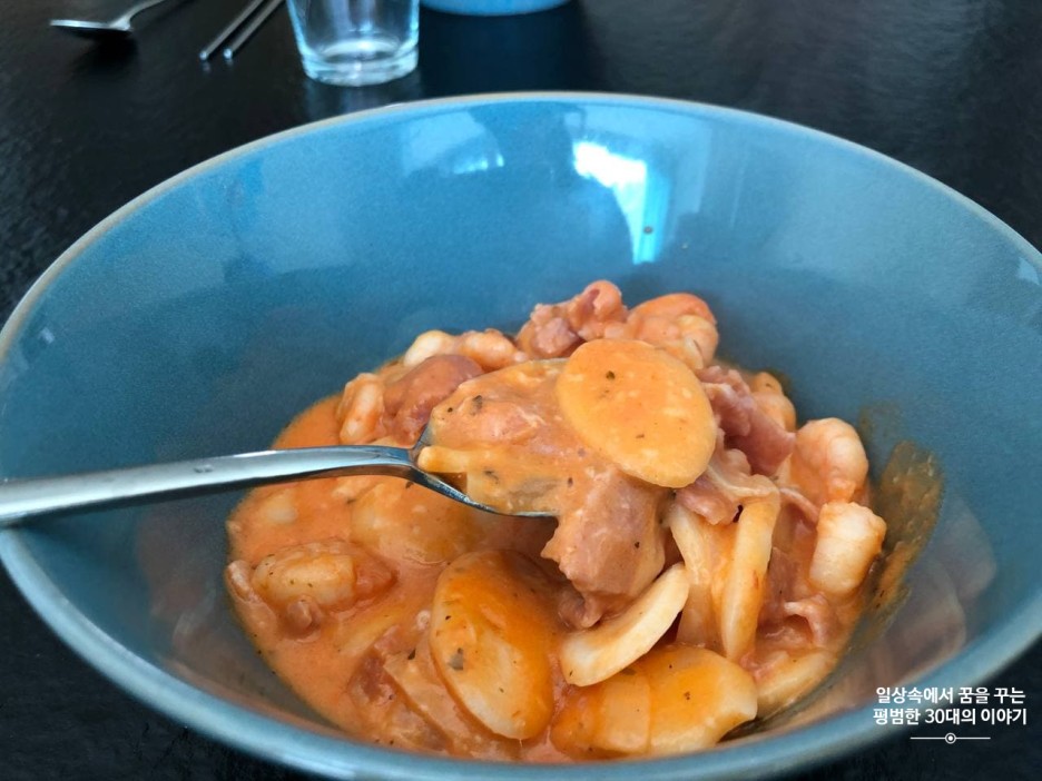 로제 떡볶이 - 베이컨, 새우, 양파, 떡국떡, 토마토소스, 우유, 파마산 치즈, 소금, 파슬리