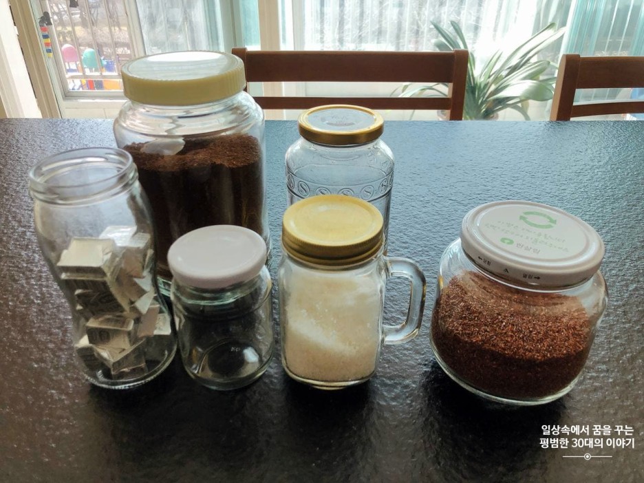 짝꿍이(참고로 내 남편은 스페인 사람) 늘 나에게 하는 말이 한국은 유럽보다 재활용을 정말 잘하는데 그만큼 과대포장이 많아 쓰레기가 많이 나온다고... 그 말에 나도 정말 공감한다. 과대포장되어 있는 상품이 참 많다. 둘이 살면서 뭔 쓰레기가 이렇게도 많이 나오는지, 쓰레기 버릴 때마다 한숨이 나온다. 줄인다고 줄여봐도 쉽지가 않다. 그래서 그 중에 재활용할 수 있는 것들은 따로 골라놓았다가 사용하기도 한다. 그중에 가장 요긴하게 재활용하는 게 유리병이다. 뜨거운 물로 유리병 안을 깨끗이 세척한 후, 잘 말려놓으면 어느 때이고 사용할 상황이 종종 생기기 때문이다. 꿀 병, 파스타 소스병, 유자차병, 탐탐 카페에서 커피 마시고 받은 커피잔을 꼼꼼히 세척한 후, 잘 말려놓았다가 지금은 커피가루, 천일염, 루이보스 찻잎, 치킨스톡 보관 통으로 잘 사용하고 있다. 요즘은 유리병 겉면에 붙어있는 스티커들도 쉽게 제거할 수 있도록 되어있어서 유리병을 재활용하기가 더욱 수월해졌다. 유리병 이외에도 견과류 세트가 들어있던 종이박스를 반으로 잘라 겉을 예쁜 천으로 싸서 잡동사니를 넣어놓을 수 있는 통으로 사용하기도 하고 명절 때 선물 받은 한우세트에 들어있던 검은색 플라스틱 통에 내가 자주 사용하는 화장품을 담아두기도 한다. 재활용 그까짓 거 뭐~ 뭐든 시작이 어렵지 하고 나면 별게 아닌 경우가 대부분이니까.