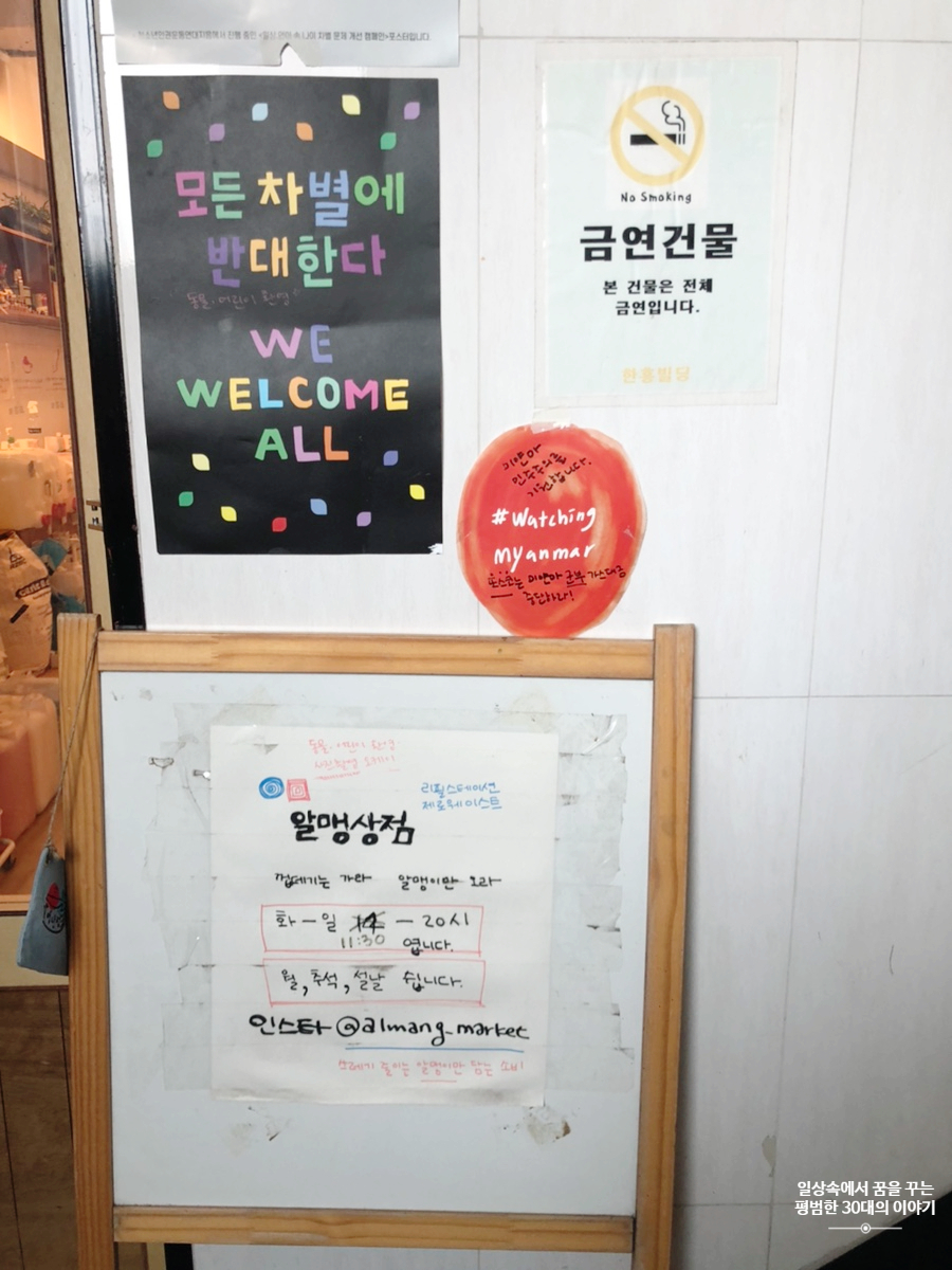 이번에 새로운 곳에 둥지를 튼 알맹상점을 방문했다.(서울역점도 있지만 내가 방문한 곳은 망원점) 이전에는 합정역에서 가까웠다면 지금은 망원역에서 가깝다. 망원시장에서 무척 가까운 곳에 위치해있어 찾기는 그다지 어렵지 않다. 그리고 공간도 예전보다 넓고 깨끗해져서 둘러보기에도 더 편했다.