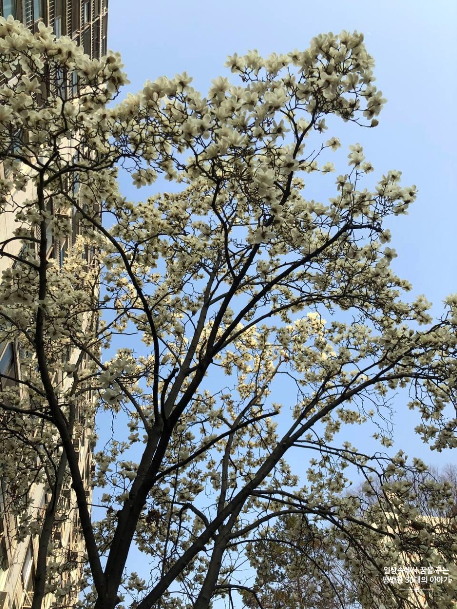 브리타 필터 해킹 재료를 사서 집으로 돌아오는 길에 하늘을 올려다보니 푸른 하늘에 하얀 꽃이 화사하게 폈더라. 봄이구나! 지화자 좋다!