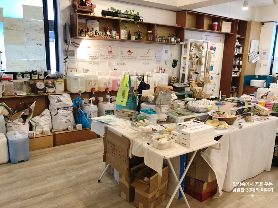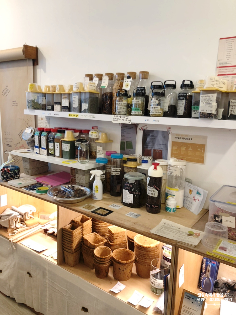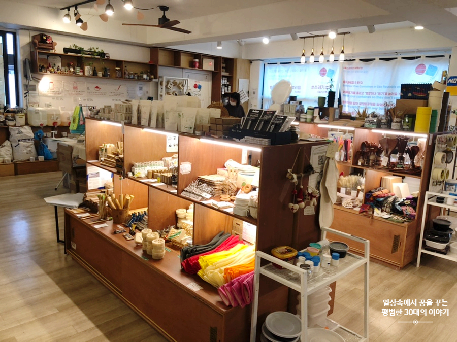 큰 대로변에 있어 찾기는 어렵지 않다. 입구가 좁아 가게가 작은 게 아닌가 싶었는데 가파른 계단을 올라가니 생각보다 꽤 넓은 공간이 나왔다. 제품도 내 생각보다는 다양했고 제품을 둘러보는 것만으로도 내가 지금 제로 웨이스트를 위해 실천하고 있는 것에 추가하여 실천할만한 것이 뭐가 있을지 배울 수 있어서 좋았다. 조금 아쉬웠던 점은 생각보다 제품 중에 중국산이 많았다는 것이다. 뭐 제품 소싱을 하다 보면 그럴 수 있겠다 싶은 게 아직 우리나라에 제로 웨이스트에 대한 개념이 자리 잡지 않았기 때문에 이런 제품을 생산하는 곳이 드물 수 있긴 하지만 앞으로 국산 제품을 더 많이 팔았으면 좋겠다는 개인적인 생각을 해보았다.