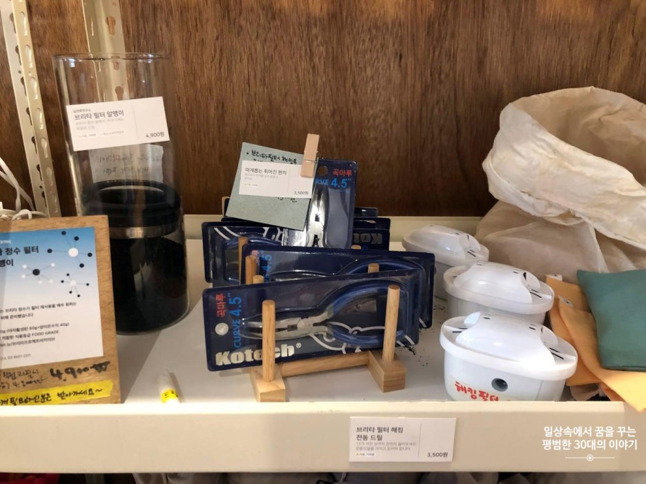 제로 웨이스트에 관심을 가지게 되면서 알게 된 알맹상점. 제로 웨이스트에 관한 다양한 제품을 팔고 있고 환경 보호를 위한 활동도 적극적으로 하는 곳이다. 제로 웨이스트에 대한 사람들의 관심이 늘면서 제로 웨이스트에 관한 제품을 파는 상점이 점차 늘어나고 있는 추세이다. 이는 기쁜 일이다. 어쨌든 평일 오후, 망원동 주변에 사는 친한 언니네 집에서 점심을 먹고 집으로 돌아가기 전 알맹상점으로 향했다. 나의 목적은 오로지 하나! 브리타 해킹 재료를 사기 위함이었다. 온라인에서도 팔지만 어떻게 생겼는지 직접 보고 구매하고 싶었다.