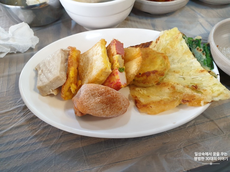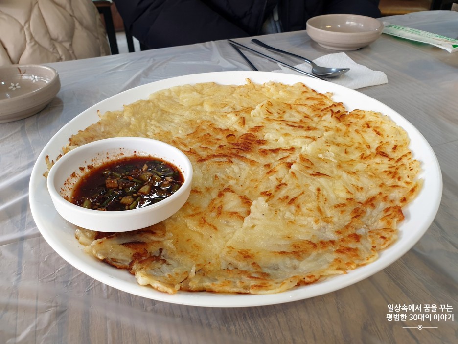우리는 4명이었기 때문에 헛제사밥 4인분에 감자 전을 주문했다. 우리가 식당에 도착했을 때만 해도 손님이 별로 없었는데 그 뒤로 계속해서 손님이 들어왔다. 그런데 헛제사밥은 전도 부치고 나물도 무치고 해야 해서 다른 메뉴보다 나오는데 시간이 엄청 오래 걸린다. 그러니 시간이 별로 없으신 분은 다른 걸 주문하는 게 좋다. 우리는 그 사실을 모른 채 주문했기 때문에 우리보다 늦게 온 다른 손님 음식이 다 나올 때까지 우리 음식이 나오지 않아 조금 예민해졌었는데 한 사람당 하나씩 준비되는 예쁜 모둠전 그릇을 보고 바로 풀렸다. 단순한 우리. 그나마 감자 전이 빨리 나와서 그걸로 허기를 채웠기에 망정이지 안 그랬으면 다들 배고파서 몇 분에 한 번씩 우리 음식 언제 나오냐고 사장님께 물어봤을 뻔!