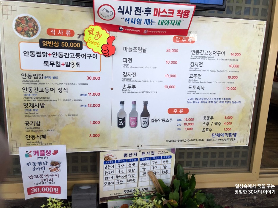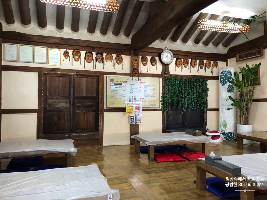안동 여행에서 빠질 수 없는 하회 마을에 간 날, 실컷 둘러보고 탈춤공연까지 시간이 두 시간 정도 남았길래 점심을 먹기 위해 들른 하회식당. 가기 전부터 이미 하회식당을 골라놓았었다. 왜냐하면 나는 이미 찜닭과 간고등어를 전날 먹었기 때문에 안 먹어본 메뉴를 시도해보고 싶었는데 마침 하회식당에 헛제사밥을 팔고 있었기 때문이다. 하회 마을 주변에 있는 식당 중 헛제사밥을 파는 곳은 별로 없었기에 고객 평도 좋고 위치도 좋아 고민 없이 선택했다. (하회 민속식당과 헷갈리지 마시길!)
