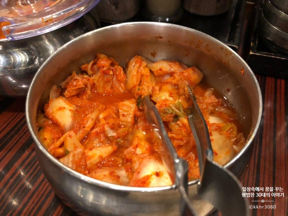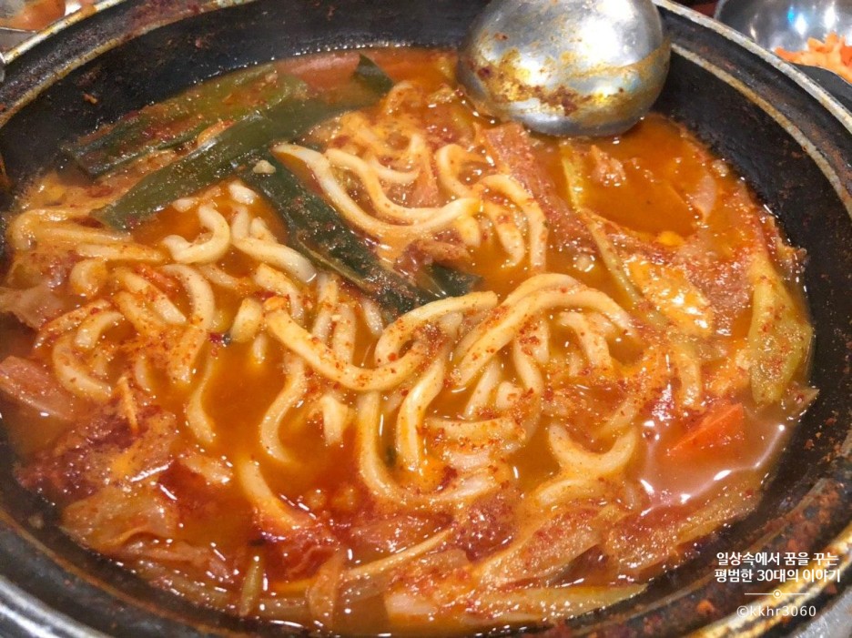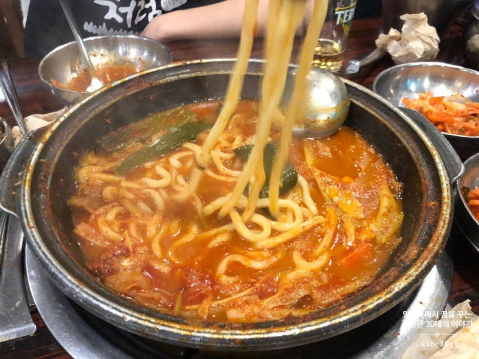 육수가 전골냄비 가득 들어있기 때문에 자칫 넘칠 수도 있기 때문에 앞치마는 필수!! 안 그러면 옷에 빨간 국물 자국이 수도 없이 남을 수도 있다. 자작한 국물을 야채 위에 살포시 조금씩 부어주면서 끓이다 보면 야채들과 곱창이 맛있게 익어간다. 익기를 기다리는 동안에는 하는 수 없이 깍두기와 김치로 허기를 달랜다. 지금에 와서 생각해보니 그래서 그 많은 김치와 깍두기를 먹어댔나 보다.