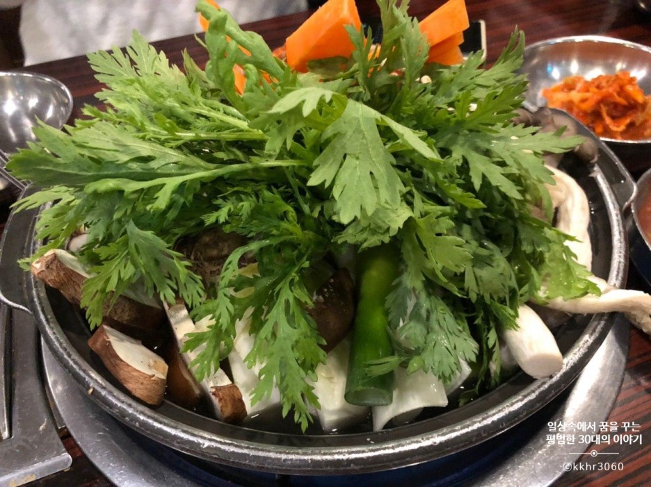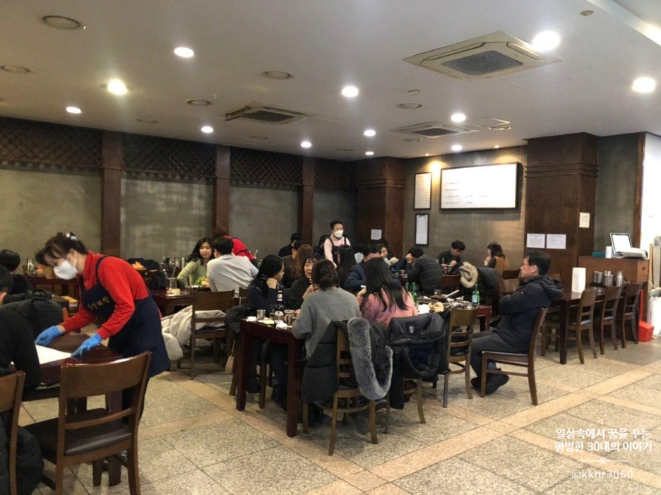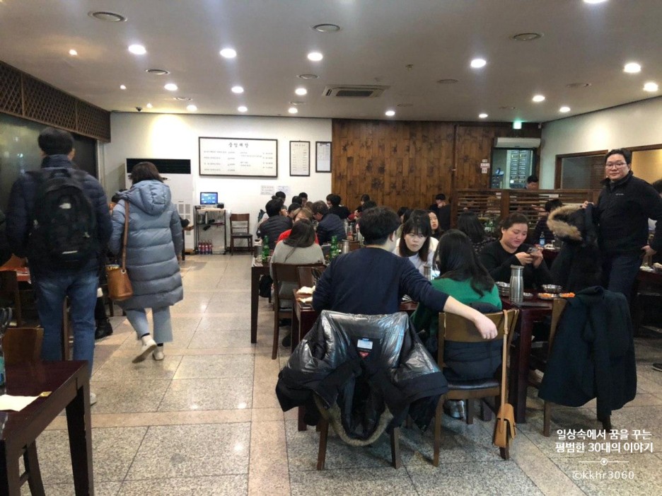 홀 내부는 꽤 넓고 룸도 두 개 정도 있는 것 같다. 그 많은 테이블들이 꽉꽉 차있다 못해 입구에는 대기하고 있는 손님들로 인산인해다. 이날뿐만이 아니고 올 때마다 같은 풍경이다. 비결이 뭘까 싶다. 나랑 같이 간 언니도 늘 이 앞을 지나갈 때면 사람이 많아서 궁금했었다고 대체 얼마나 맛있길래 사람들이 늘 이렇게 많은지 먹어보고 싶었다고 몇 시간이고 기다려서 이번 기회에 꼭 먹어야겠다기에 입김이 나는 입구에 앉아서 한참을 기다렸다. 다행히 대기자 명단에 이름을 올려놓고 자리를 비운 대기자들이 많아 30분 만에 자리를 안내받을 수 있었다.