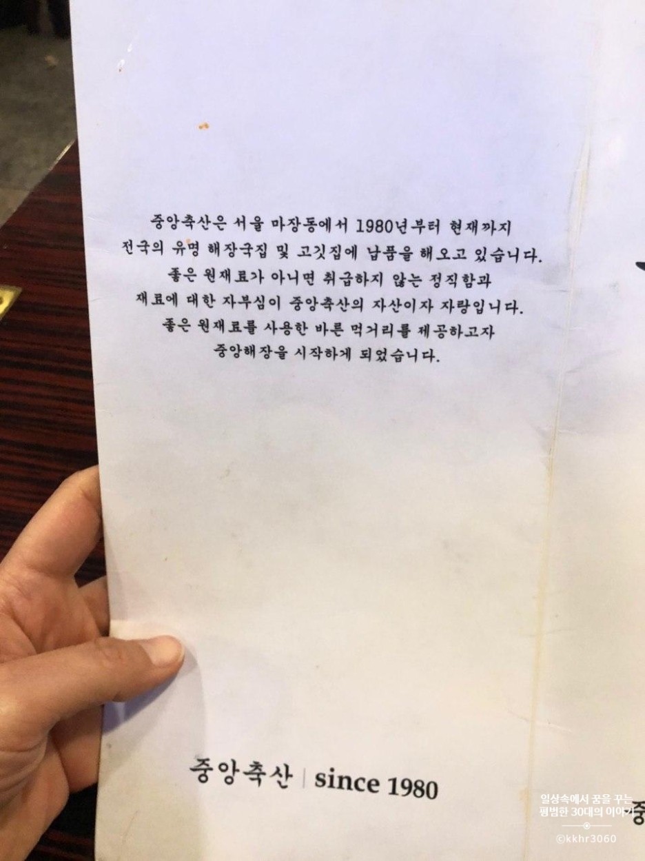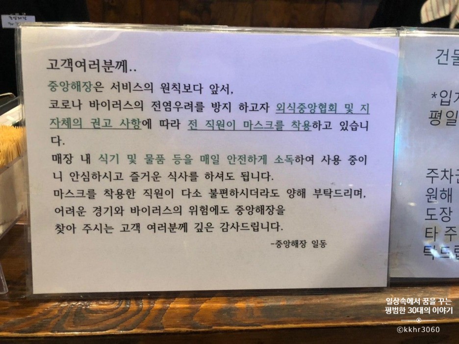 어쨌든 그런 언니를 오랜만에 만나 무엇을 먹으면 좋을까 고민하다가 내가 날도 추우니 뜨끈한 탕이 어떻겠냐고 했고 언니가 곱창전골이 먹고 싶다고 했다. 곱창전골 잘 하는 집이 많지 않아 선택지가 별로 없었다. 우리의 선택은 삼성역 근처에 있는 중앙해장. 회식으로만 몇 번 가봤는데 맛이 꽤 있어서 기억에 남았다. 하지만 가격이 비싸고 대기가 늘 길어 선뜻 가게 되지는 않는 곳이다.
