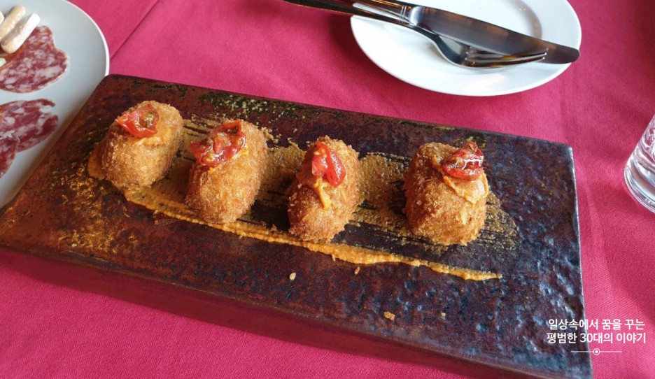 우리는 둘이서 이베리코 프레사(19000원), 크로켓 4개(1개당 3000원), 생오징어 구이(18000원), 핀쵸 솔로미요(10000원), 플라또 데 엠부띠도스(23000원), 수제 빵과 소스(3000원), 매일 달라지는 특별한 디저트(5000원) 그리고 커피 한 잔(3000원)을 주문했다. 주문할 때, 둘이 너무 많이 시키는 거 아닌가 싶었는데 딱 적당하게 맛있게 먹었다. 점심 안 먹은 보람이 있었다는!