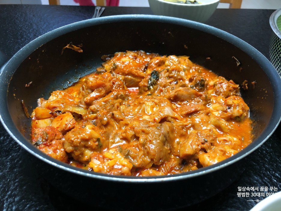 김치 등갈비찜 - 김치, 고춧가루, 맛술, 생강가루, 국간장, 다진 마늘, 들기름, 후추, 진 참치 액, 등갈비, 멸치 다시마 육수