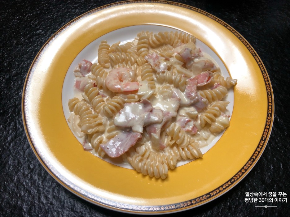 크림 파스타 - 새우, 베이컨, 양파, 파스타면, 생크림, 우유, 치즈, 허브소금, 진 참치 액, 후추