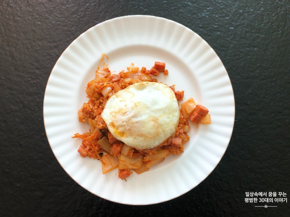 스팸 김치볶음밥 - 스팸, 김치, 양파, 고추장, 설탕, 버터, 진 참치 액, 계란