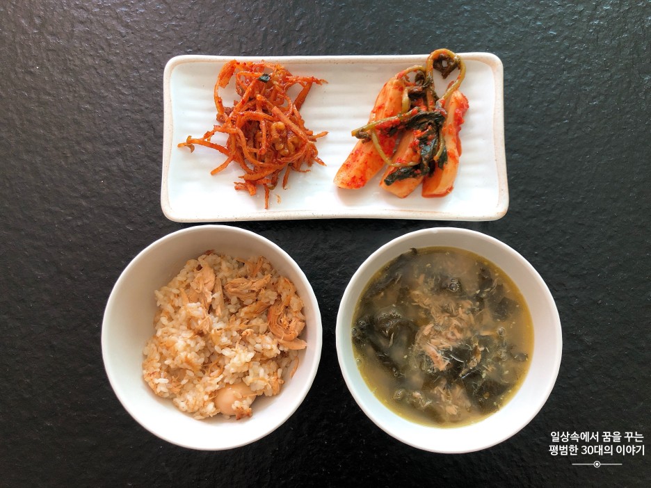 메뉴: 진미채볶음, 총각김치, 참치 미역국, 장조림 버터 볶음밥