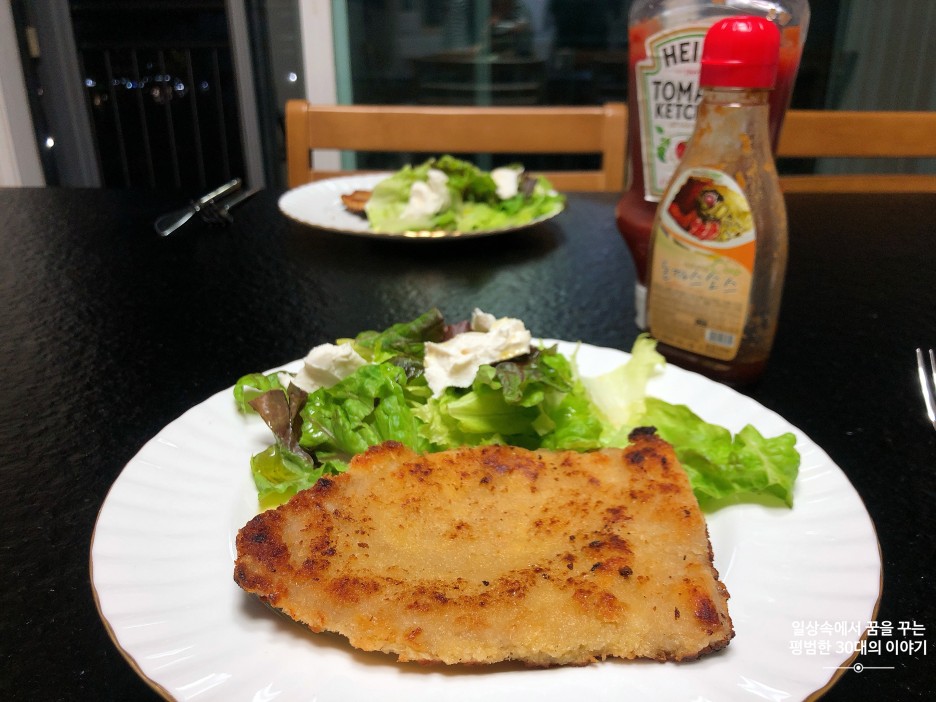 저녁: 리코타치즈 샐러드, 돈가스 |