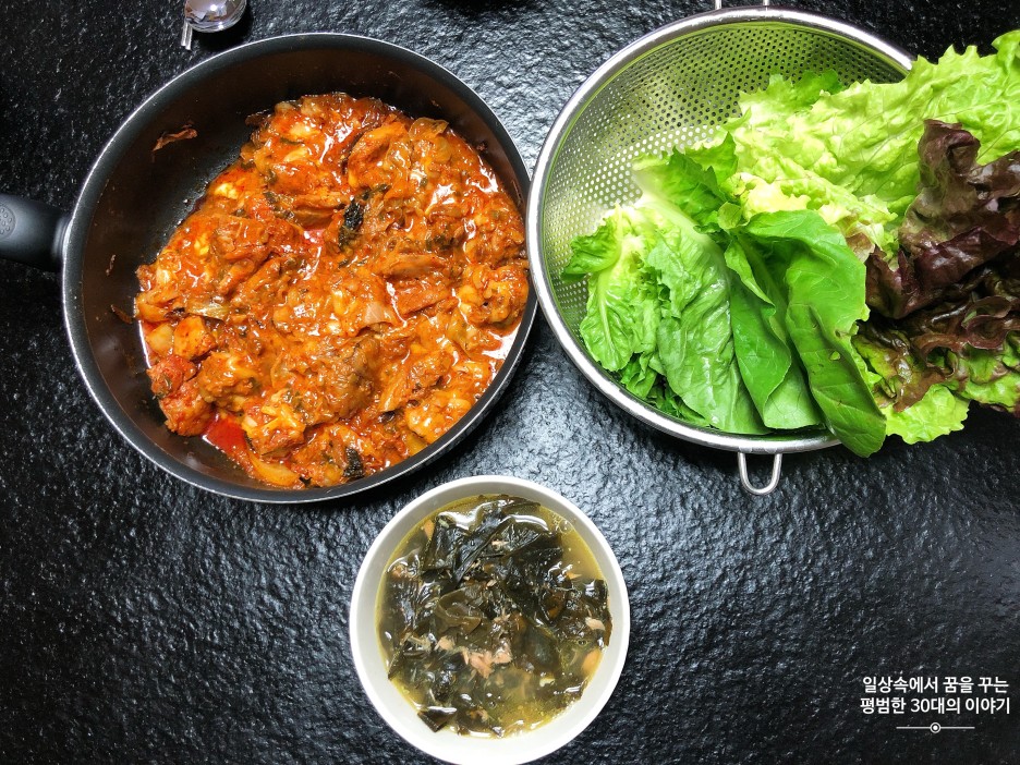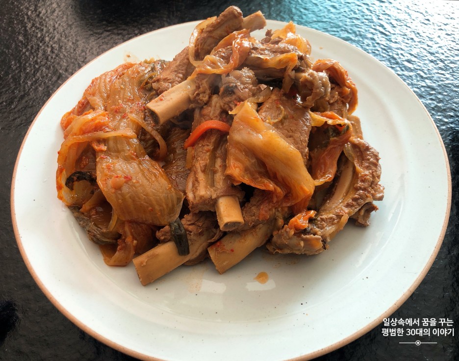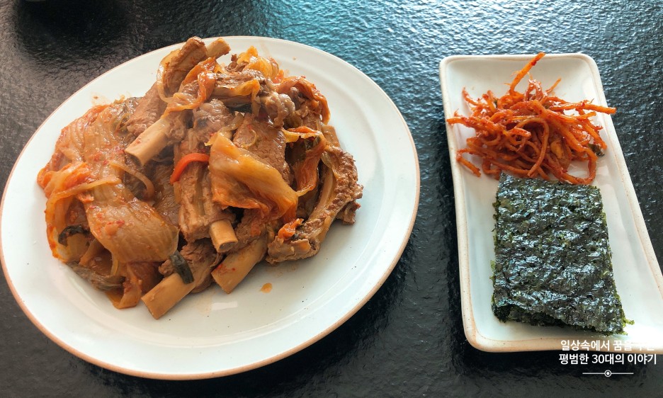 메뉴: 김치 등갈비찜, 진미채볶음, 김