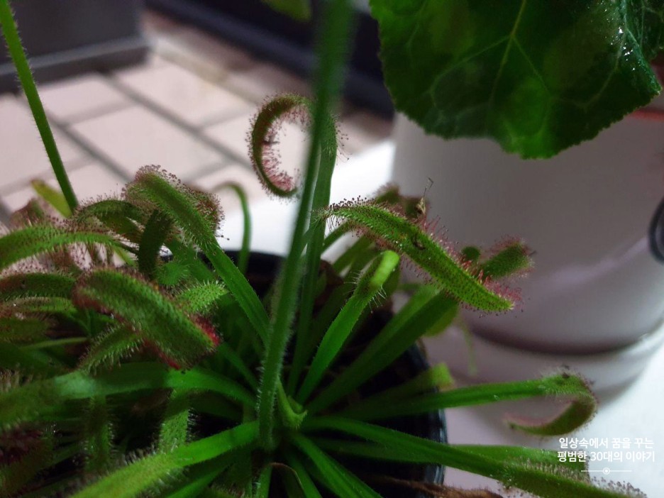 그러던 어느 날, 화분을 사러 꽃집에 갔다가 파리지옥과 끈끈이주걱을 발견했다. 생김새가 좀 께름칙하게 생겨서 사고 싶지 않았지만 남편의 끈질긴 설득으로 결국 파리지옥과 끈끈이주걱을 사 오게 됐다. 이게 뭔 효과가 있겠나 싶은 의구심이 마음속에서 일었지만 남편이 워낙 지극정성으로 가꾸었기에 겉으로 내색하진 않았다. 그런데 이게 웬걸.. 며칠 지나자 끈끈이주걱 잎에 붙은 긴 털인 선모에 날파리와 모기가 붙어있는 게 아닌가! 파리지옥은 그다지 효과가 없었지만 끈끈이주걱은 여름 내내 수많은 날파리와 모기를 잡아 주었다. 그래서 그 뒤로 스프레이형 퇴치제는 웬만하면 쓰지 않게 되었고 홈 매트는 캠핑이나 여행 갈 때만 사용하고 있다. 우리 건강에도 좋고 환경에도 좋은 방법!