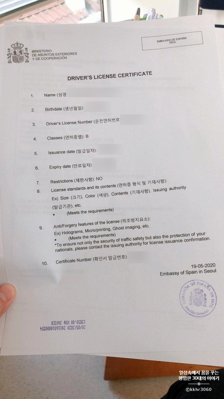 그렇게 스페인 대사관에서 발급받은 '면허증에 대한 대사관 확인서'.