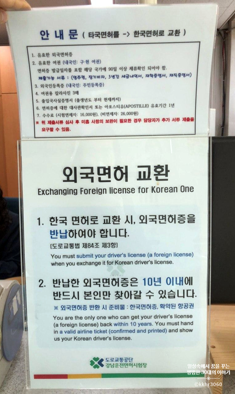 가끔 짝꿍과 국내 여행을 다니곤 하는데 그럴 때 가끔 차를 렌트 하기도 한다. 처음에는 스페인에서 발급받은 국제면허증으로 한국에서 차를 렌트하기도 했었으나 매번 스페인에 갈 때마다 국제면허증을 갱신해야 하는 번거로움이 있어 이번에 아예 한국 국내 면허증을 발급받기로 했다. 짝꿍은 그럴 바엔 나보고 운전을 하라고 하는데 내 면허증은 장롱면허로 운전이 두렵기만 한 나는 쫄보라서 바로 외국면허를 한국 국내 면허로 교환하는 방법을 알아보기 시작했다.