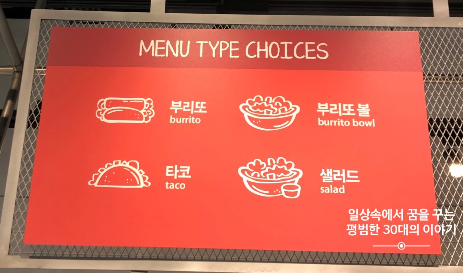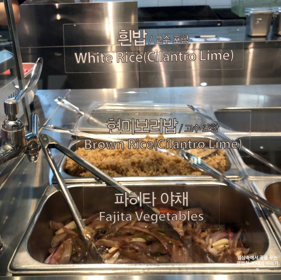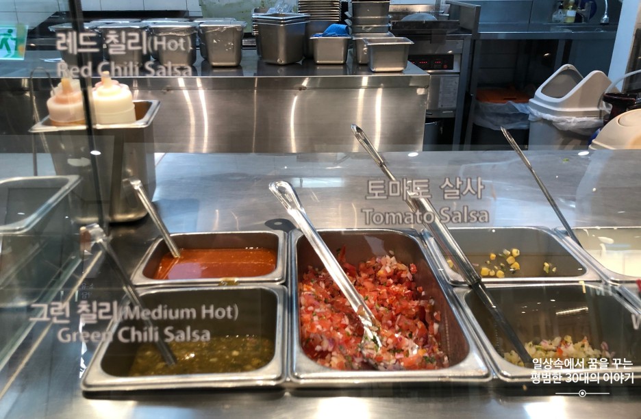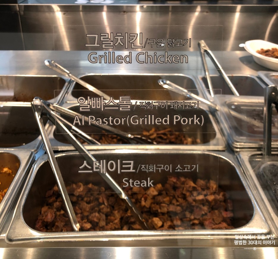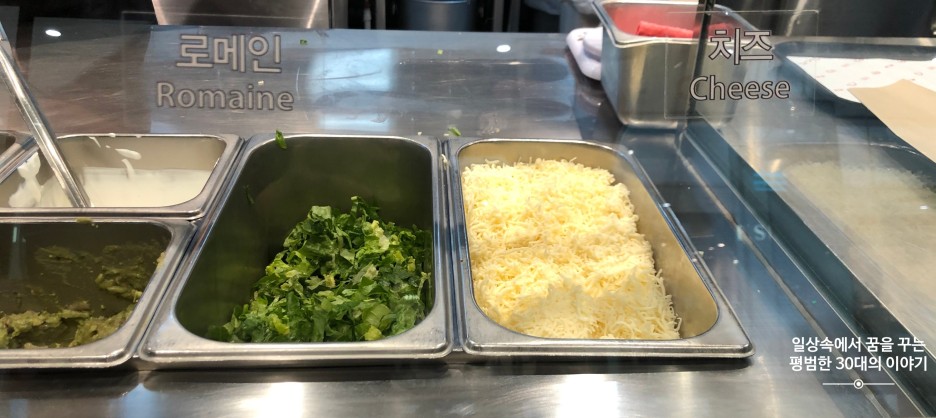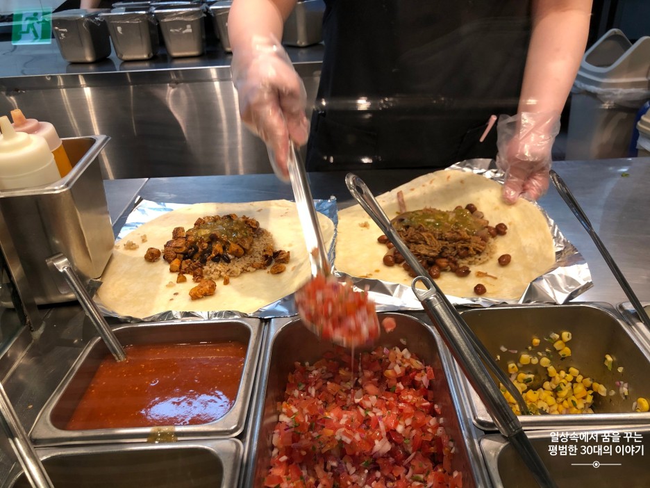 서브웨이와 비슷한 방식으로 주문을 하면 되는데, 우선 부리또, 부리또 볼, 타코 그리고 샐러드 중 한 가지 메뉴를 고른 후, 내가 원하는 토핑 재료를 마음껏 골라 넣으면 된다. 직접 토핑의 상태를 봐가며 고르는 재미가 꽤 쏠쏠하다.