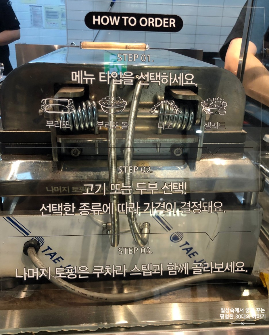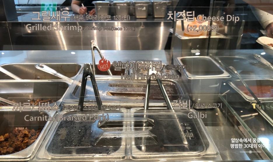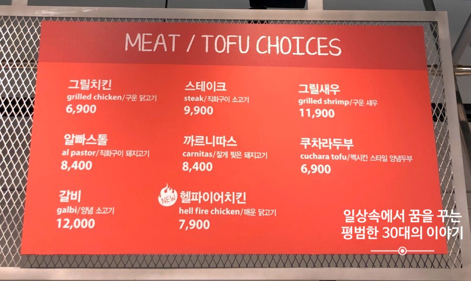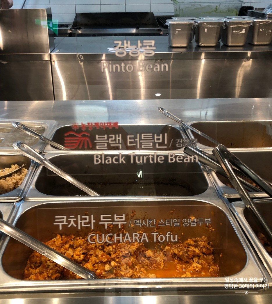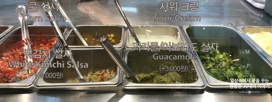 서브웨이와 비슷한 방식으로 주문을 하면 되는데, 우선 부리또, 부리또 볼, 타코 그리고 샐러드 중 한 가지 메뉴를 고른 후, 내가 원하는 토핑 재료를 마음껏 골라 넣으면 된다. 직접 토핑의 상태를 봐가며 고르는 재미가 꽤 쏠쏠하다.