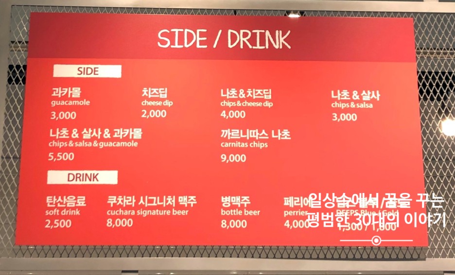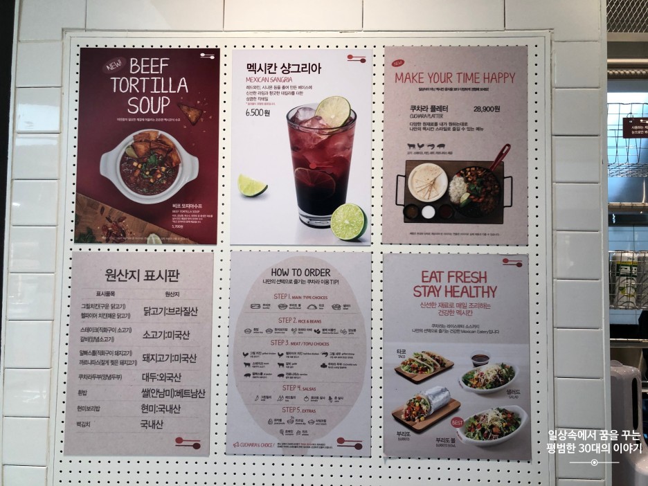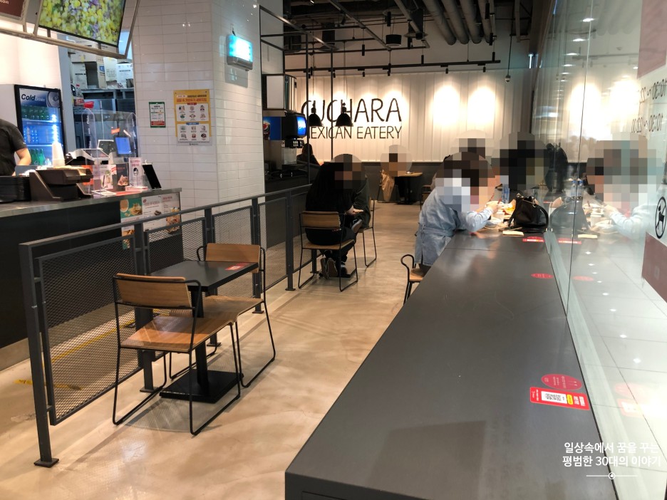 배터리를 교체하고 나니 그제서야 잊고 있던 허기가 밀려왔다. 짝꿍에게 뭐 먹고 싶냐 물어보니 당연히 쉑쉑버거! 그놈에 쉑쉑버거를 왜 그리 좋아하는지 타임스퀘어만 오면 매번 쉑쉑버거 노래를 불러대는 통에 타임스퀘어 가는 날은 쉑쉑버거 먹는 날이기도 하다. 그런데 나는 좀 새로운 걸 먹어보고 싶었던 탓에 짝꿍에게 뭐 먹고 싶냐 물어본 게 무색하게 새로운 메뉴에 도전해보자고 제안했다. 다행히 짝꿍이 나의 제안에 기분 나빠하지 않고 열심히 식당을 검색해보더니 쿠차라라는 멕시코 음식점에 가보는 게 어떠냐며 제안하더라. 그래서 냉큼 콜을 외친 나! (이 포스팅을 하기 위해 찾아보니 체인점이더라; 그런데 난 왜 처음 들어보지... 하기야 체인 지점이 많지는 않더라)