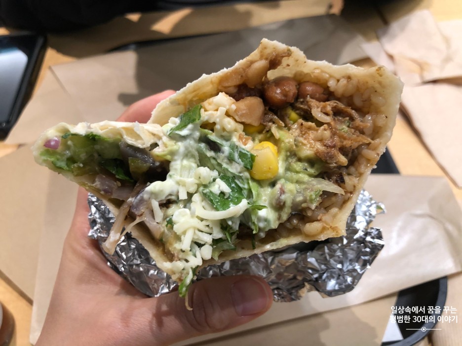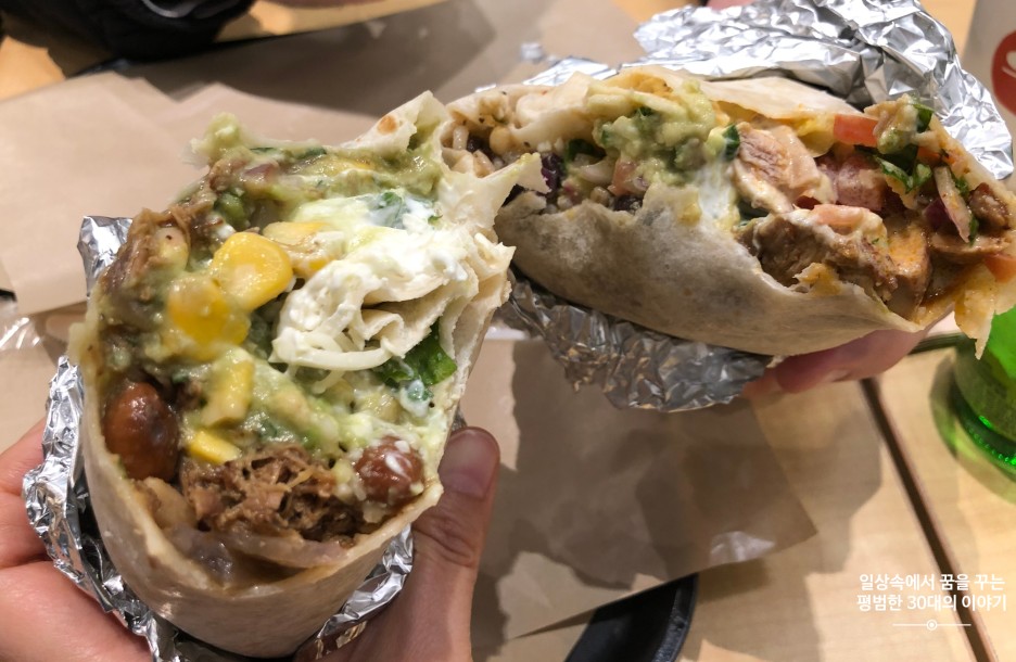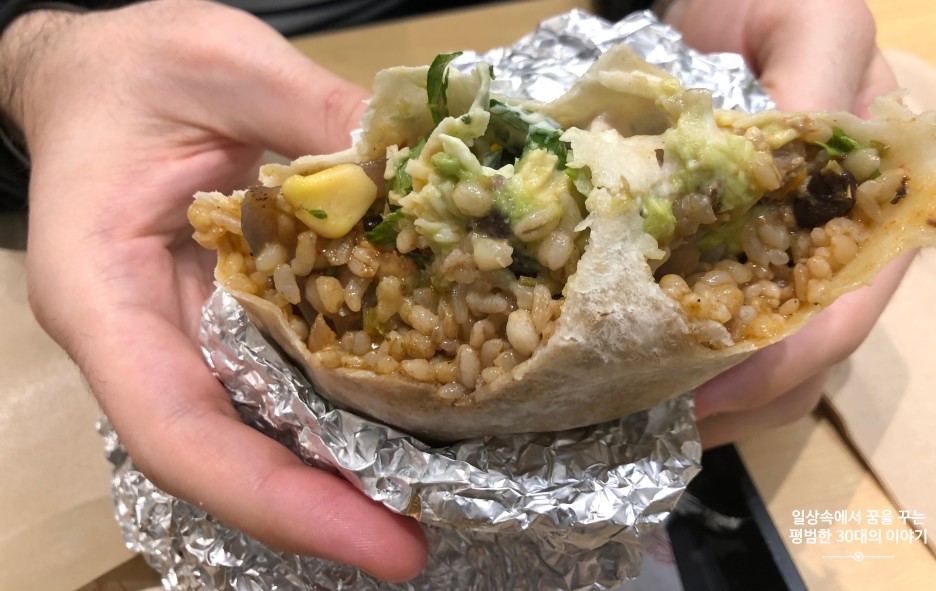 우리가 고른 토핑으로 만들어진 부리또가 계산하는 사이 바로 준비됐다. 엄청 무겁고 두꺼워서 먹는 중간에 배가 불러 끝까지 다 먹는데 너무 힘들었다. 부리또 같은 경우 딱 두 개의 부리또를 만들기 위해 사야 하는 재료가 너무 많기 때문에 집에서 만들어 먹으려면 여간 귀찮은 게 아니라서 가끔 먹고 싶을 때 이곳에 와서 먹기로 짝꿍과 합의했다. 그만큼 엄청나게 만족스러웠던 점심이어서 좀만 더 집에서 가까웠으면 일주일에 한 번은 갔을 듯;