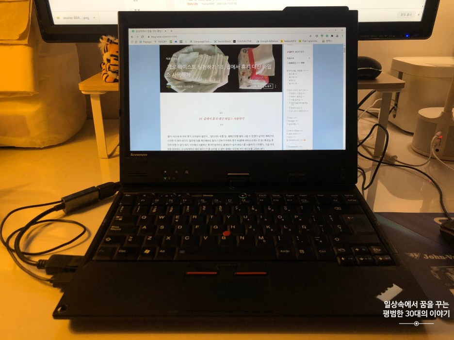 노트북의 경우 핸드폰보다야 더 오래 사용하긴 했지만 그래도 5~6년 주기로 바꾸곤 했었다. 그런 내가 결혼 전, 사용하던 노트북은 깨끗이 정리하여 엄마한테 드리고 나는 짝꿍이 사용하던 10년 된 노트북을 사용하고 있다. 덕분에 이전에 사용해본 적도 없는 Linux 운영체제를 사용하고 있는데 생각보다 만족도가 높다. 자칭 컴퓨터 전문가 짝꿍 말로는 배터리 문제 말고는 전혀 없다는데 사실 전원을 늘 꽂아서 사용하기 때문에 불편하게 느껴지지 않는데 가끔 카페나 여행에 노트북을 가지고 갈 때는 몇 시간 버틸 수 없어서 나중에는 배터리만 따로 구매해 교체할까 싶기도 하다. (배터리 교체 비용 3~4만 원, 배터리 용량에 따라 다름)