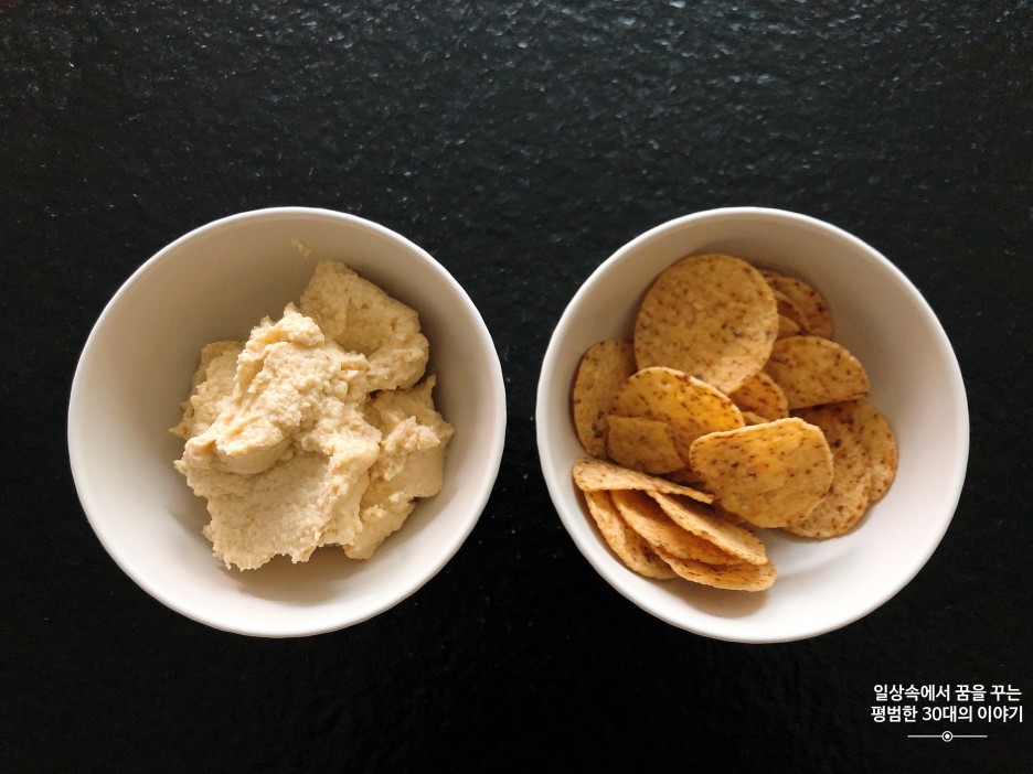 후무스 - 병아리콩, 마요네즈, 다진 마늘, 깨소금, 소금, 올리브오일, 병아리콩 삶은 물, 라임즙