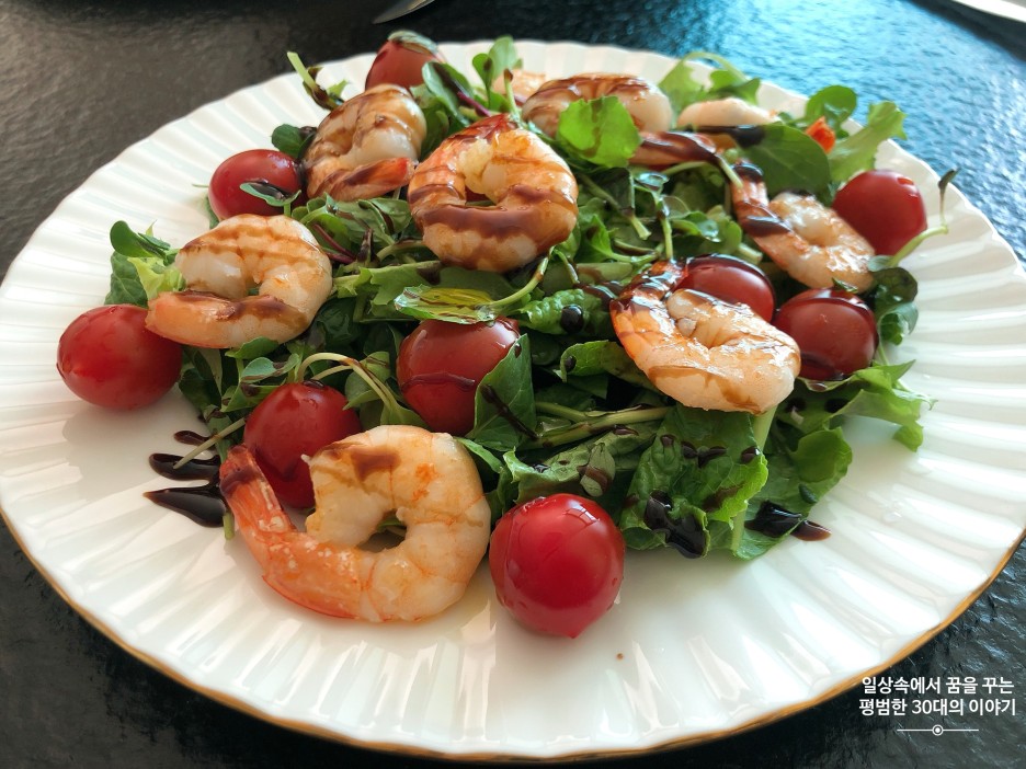 새우 샐러드 - 샐러드 야채, 새우, 방울토마토, 발사믹 소스, 올리브오일