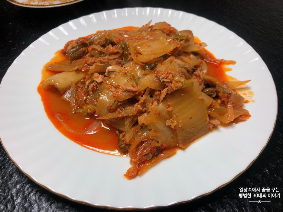 두부김치 - 두부, 김치, 설탕, 물, 고춧가루, 참치 액, 참기름