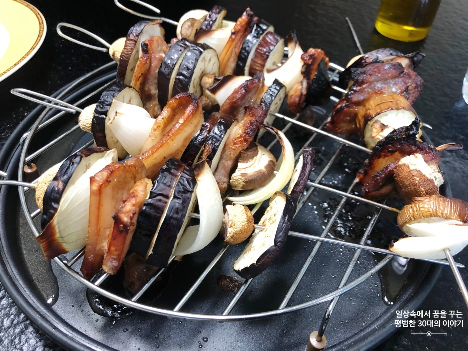 꼬치 오븐 구이 - 삼겹살, 양송이버섯, 가지, 양파, 간장, 설탕, 참기름, 후추