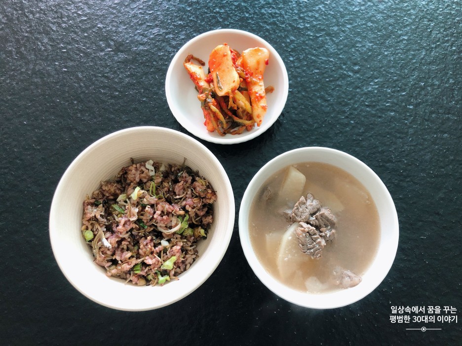 점심: 멸치 버터 볶음밥, 뭇국, 총각김치 저녁: 직접 구운 호밀빵, 계란 프라이, 베이크드 빈, 크림치즈, 딸기잼 |
