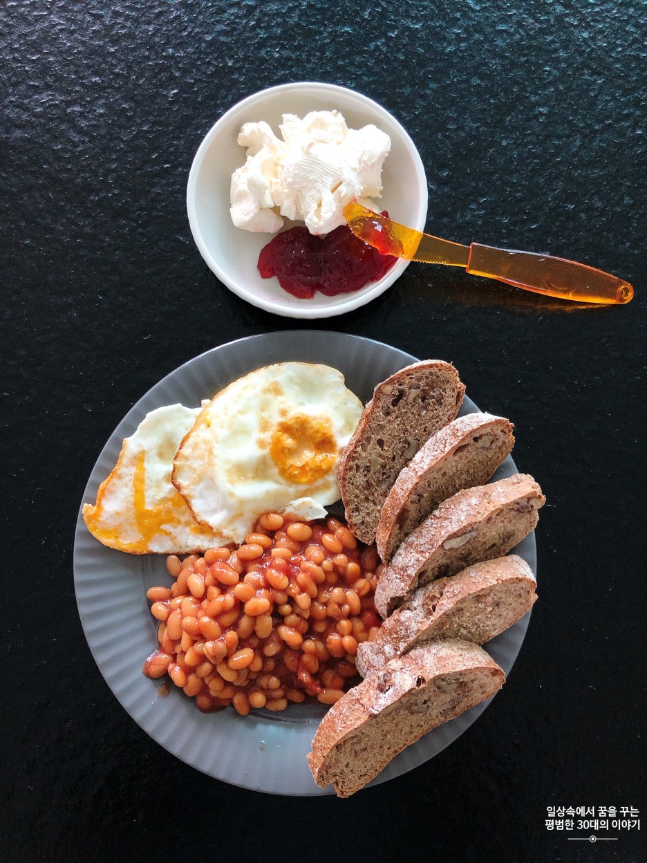 메뉴: 직접 구운 호밀빵, 계란 프라이, 베이크드 빈, 크림치즈, 딸기잼