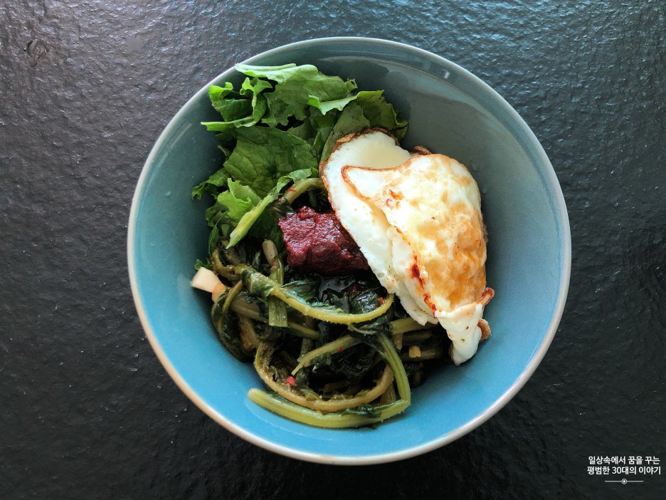 열무김치 비빔밥 - 열무김치, 계란 프라이, 참기름, 고추장, 상추