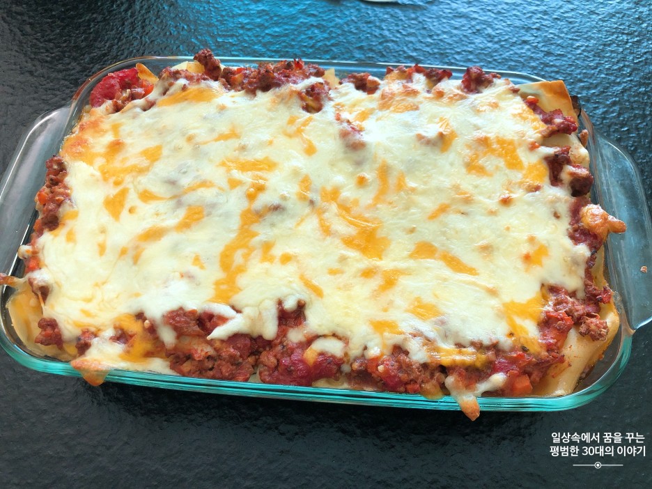 라자냐 - 양파, 당근, 양송이버섯, 홀 토마토, 가지, 간 돼지고기, 간 소고기, 치킨스톡, 오레가노, 바질, 타임, 월계수잎, 라자냐 면, 피자치즈