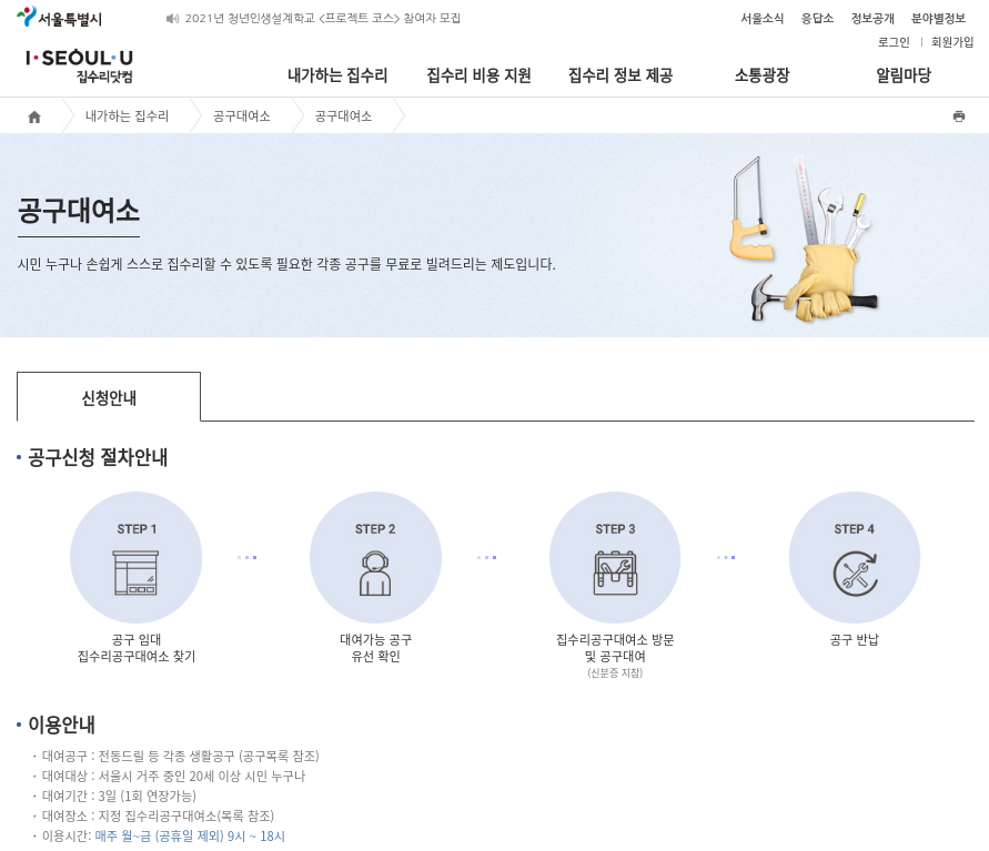 아래 웹사이트에 접속한 뒤, 내가 하는 집 수리-공구 대여소를 클릭하면 더 많은 정보를 찾을 수 있다.