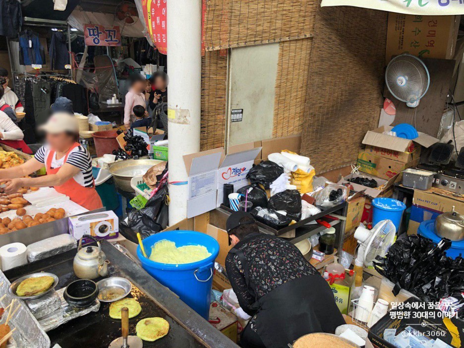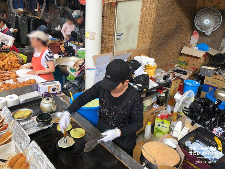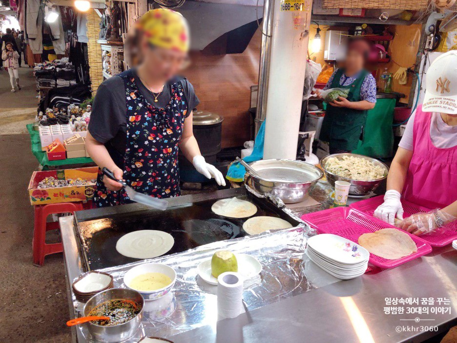 사실 제주시 민속오일장에는 길거리 음식이 다양하지 않다. 지나가던 길에 그나마 사람이 가장 바글거리고 뒤에서 쉴 새 없이 도넛과 튀김을 튀겨내고 있는 집이 있기에 한 번 먹어봤는데 특별한 맛은 아니었다. 그 옆집에서는 호떡을 팔고 있었는데 튀김으로도 채워지지 않는 허기 탓에 한 번 먹어봤다. 우리 집 앞에 있는 호떡집보다 맛이 못하다. 큰 기대감 없이 허기진 배를 채울 요량이라면 먹어도 좋다. 그나마 제주시 민속오일장에서 가장 특색이 있었던 것은 빙떡. 메밀가루를 묽게 반죽하여 기름을 두른 번철에 얇게 펴서 구운 뒤 그 가운데에 삶은 무를 양념한 것을 넣고 말아서 지져낸 것이 빙떡인데 특별해 보이지 않지만 담백하니 부드러워 앉은 자리에서 3~4개는 거뜬히 먹을 수 있겠더라. 제대로 된 빙떡을 맛보기가 점점 어려워지는 것이 제주도의 실상인지라 제주시 민속오일장에 들른 김에 먹으면 더할 나위 없이 좋을 듯하다.